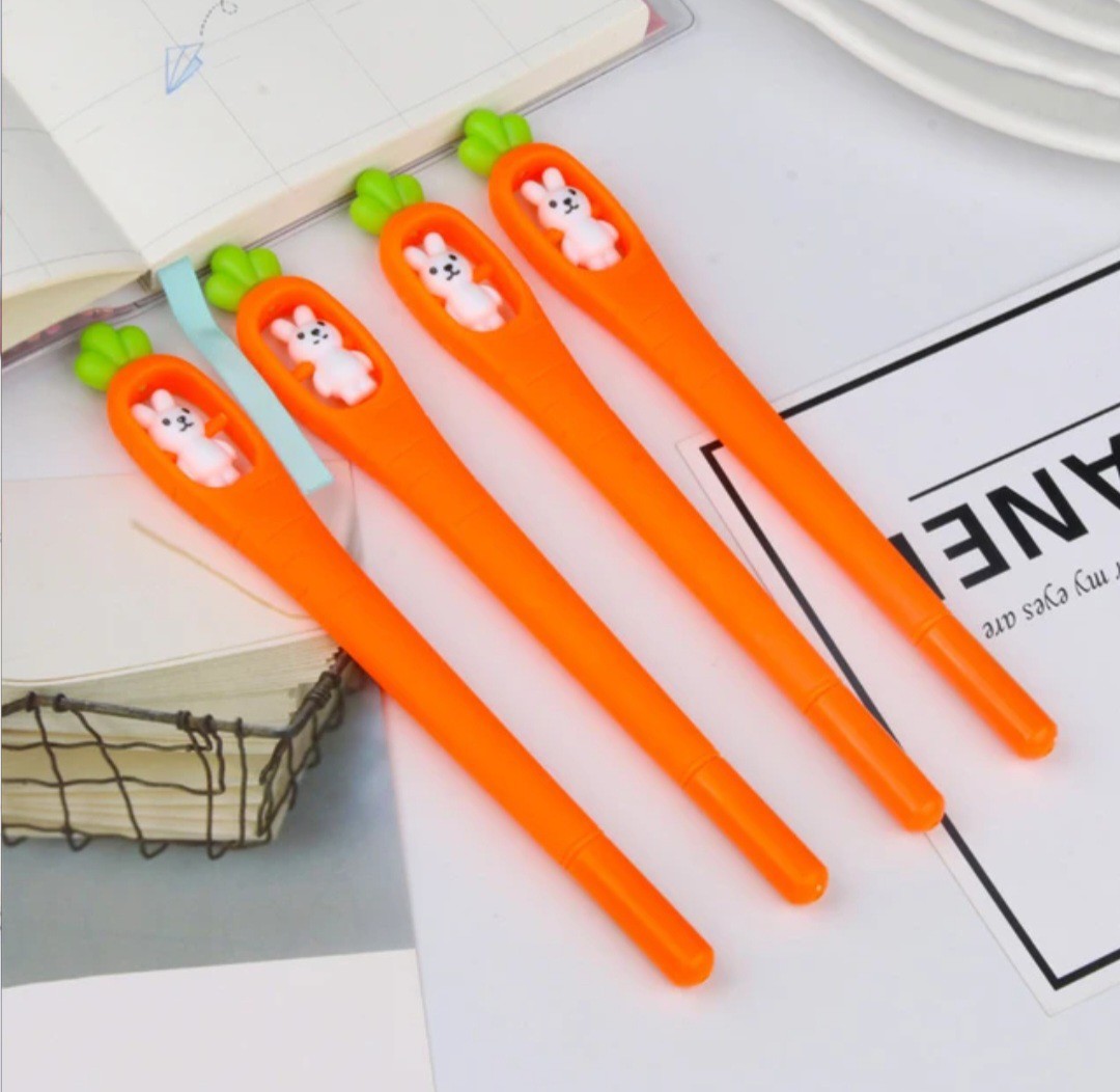 Caneta de cenoura com coelho giratório, na cor da tinta azul, ponta fina.