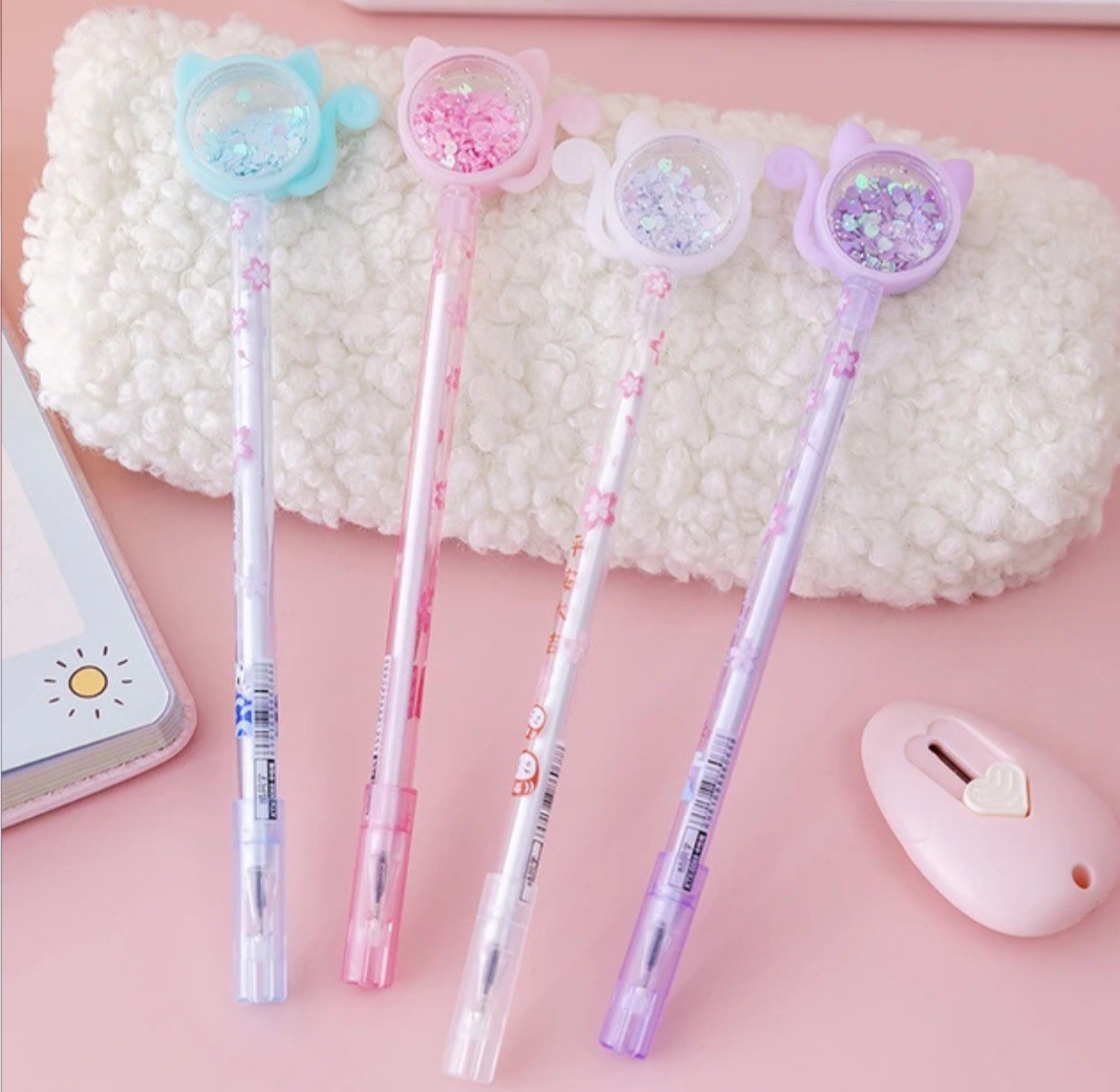Caneta gatinha com lantejola, tinta preta em gel.