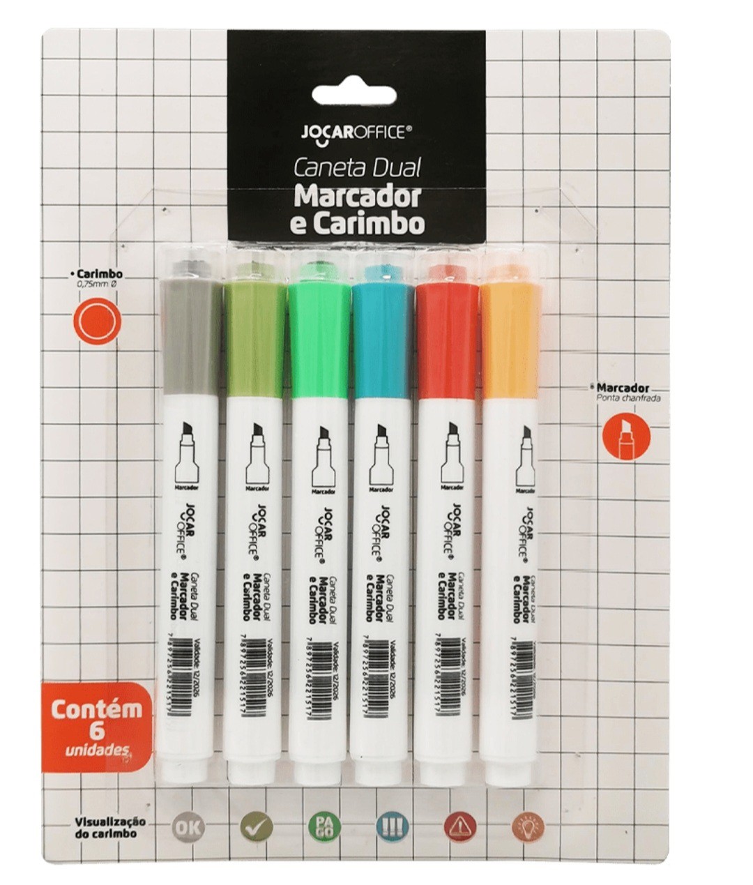 Deixe sua marca com a caneta dual Jocar Office. Ela serve como carimbo, com 0.75mm, e marcador, que vem com uma configuração de estampa exclusiva no Brasil e ponta chanfrada, garantindo melhor precisão no seu traço. É perfeita para marcar e grifar documentos profissionais, escolares e pessoais.