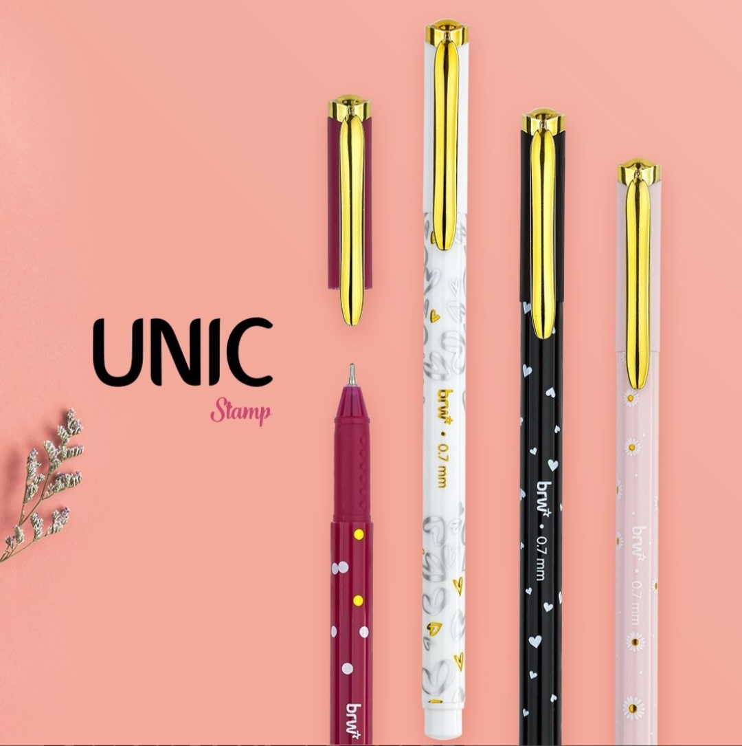 Caneta com corpo plástico decorado. Tinta azul e ponta agulha.