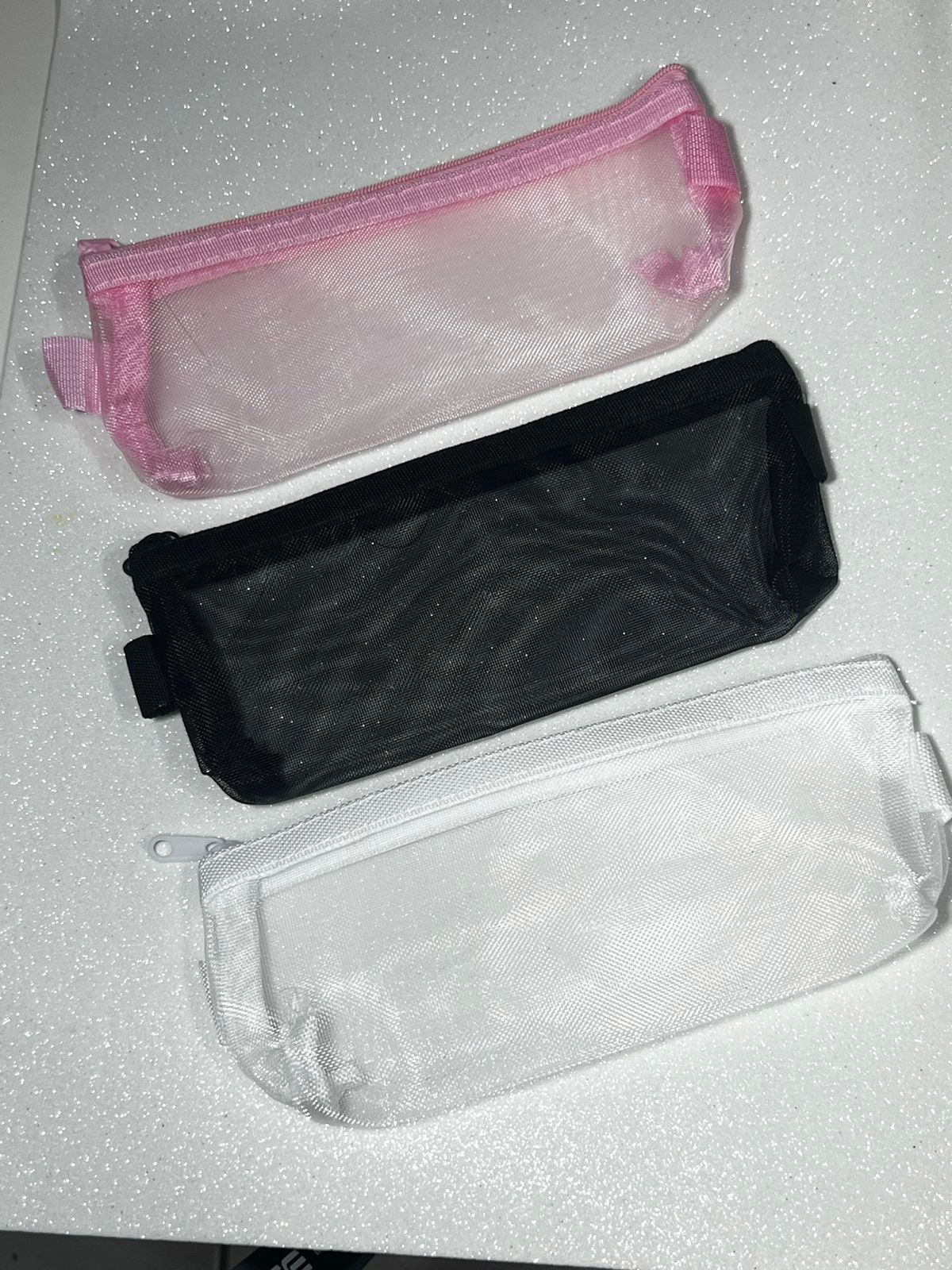Esse estojo de telinha transparente tem medidas de 21 cm de comprimento e 8,5 cm de largura. É ideal para organizar e guardar seus acessórios e objetos pequenos de forma prática e visível.