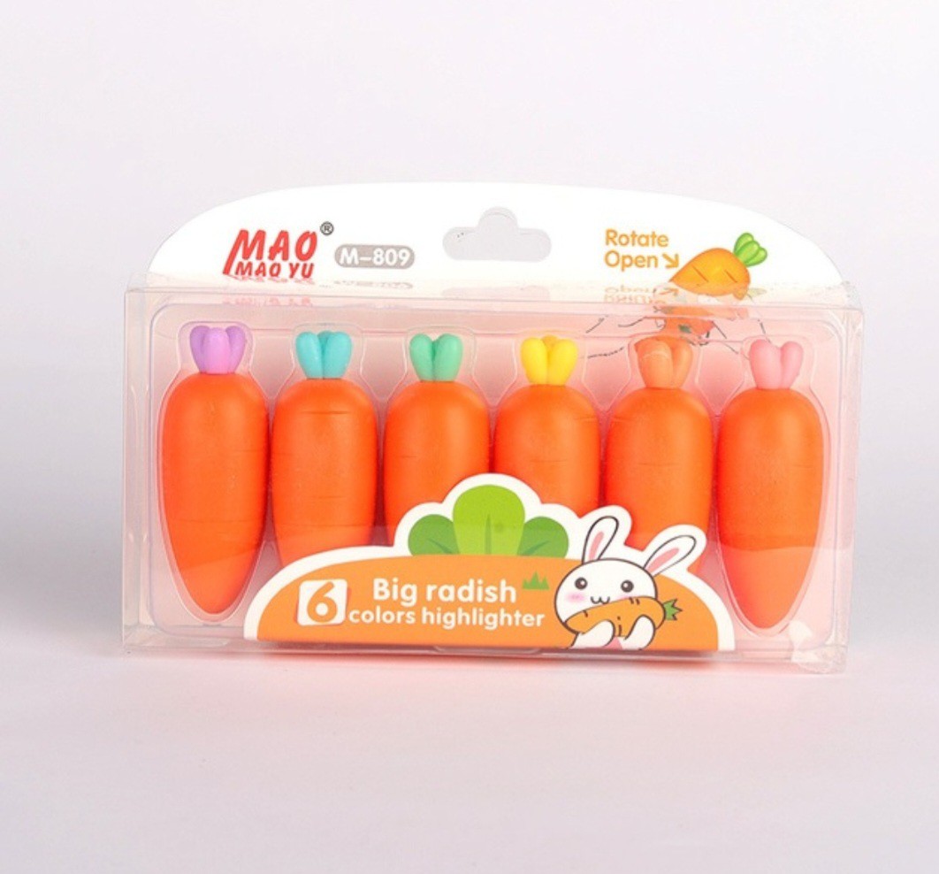 Marca texto de cenoura nas cores: azul, laranja, amarelo, rosa, verde e roxo.